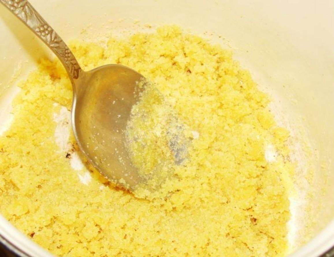 Тем временем растопите сливочное масло в другой кастрюле. Поджарьте манную крупу в масле около 15 минут, постоянно помешивая, до появления коричневатого оттенка.