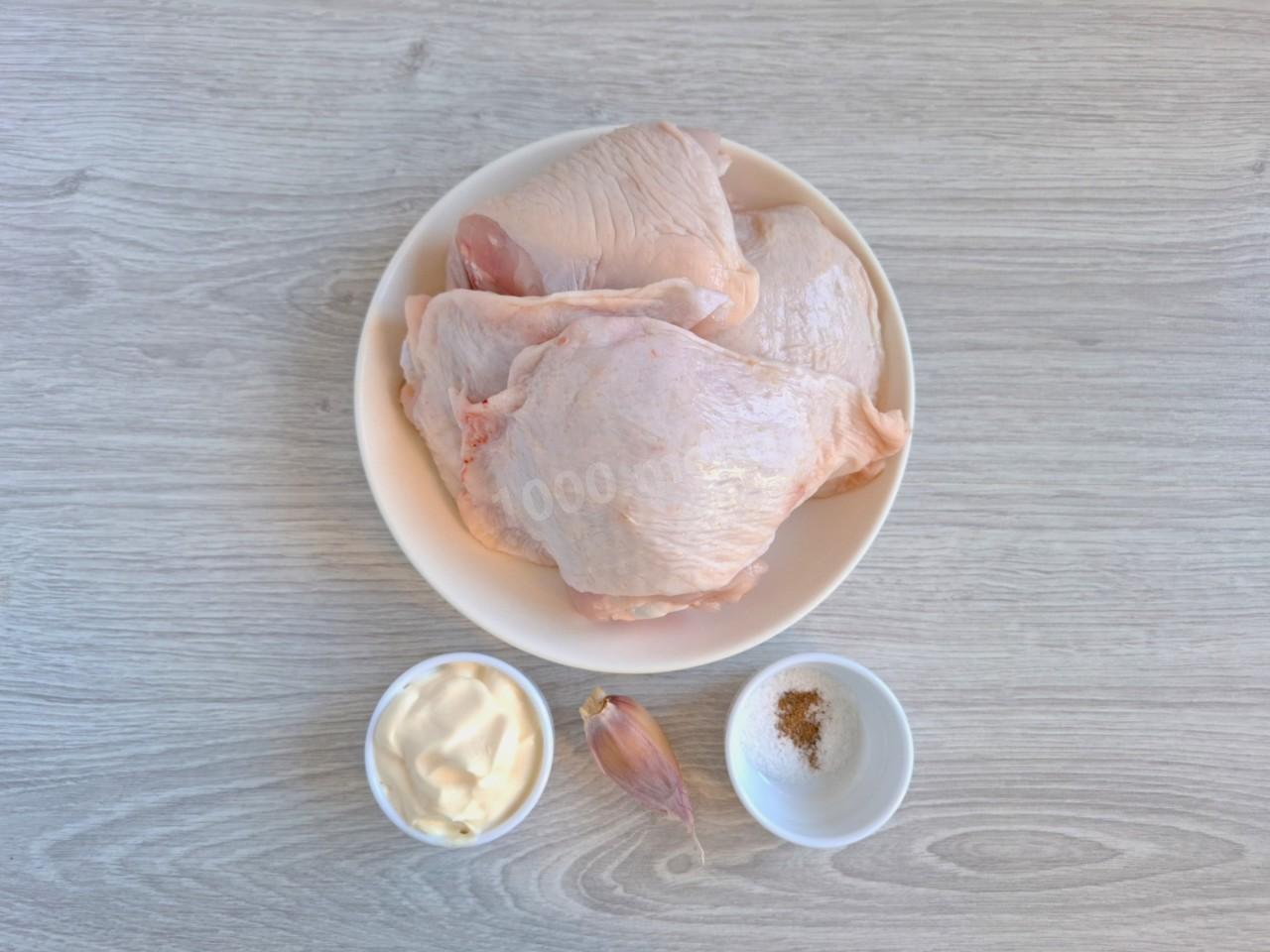 Подготовьте необходимые ингредиенты. Кроме бедер, можно взять любые части курицы. Если мясо заморожено, разморозьте его на нижней полке холодильника. Чеснок подойдет как свежий, так и в порошке. Количество соли и специй берите на свой вкус. Майонез подойдет любой на ваш вкус. Полезную информацию о правильной разморозке, а также рецепты домашнего майонеза вы найдете в описании рецепта.