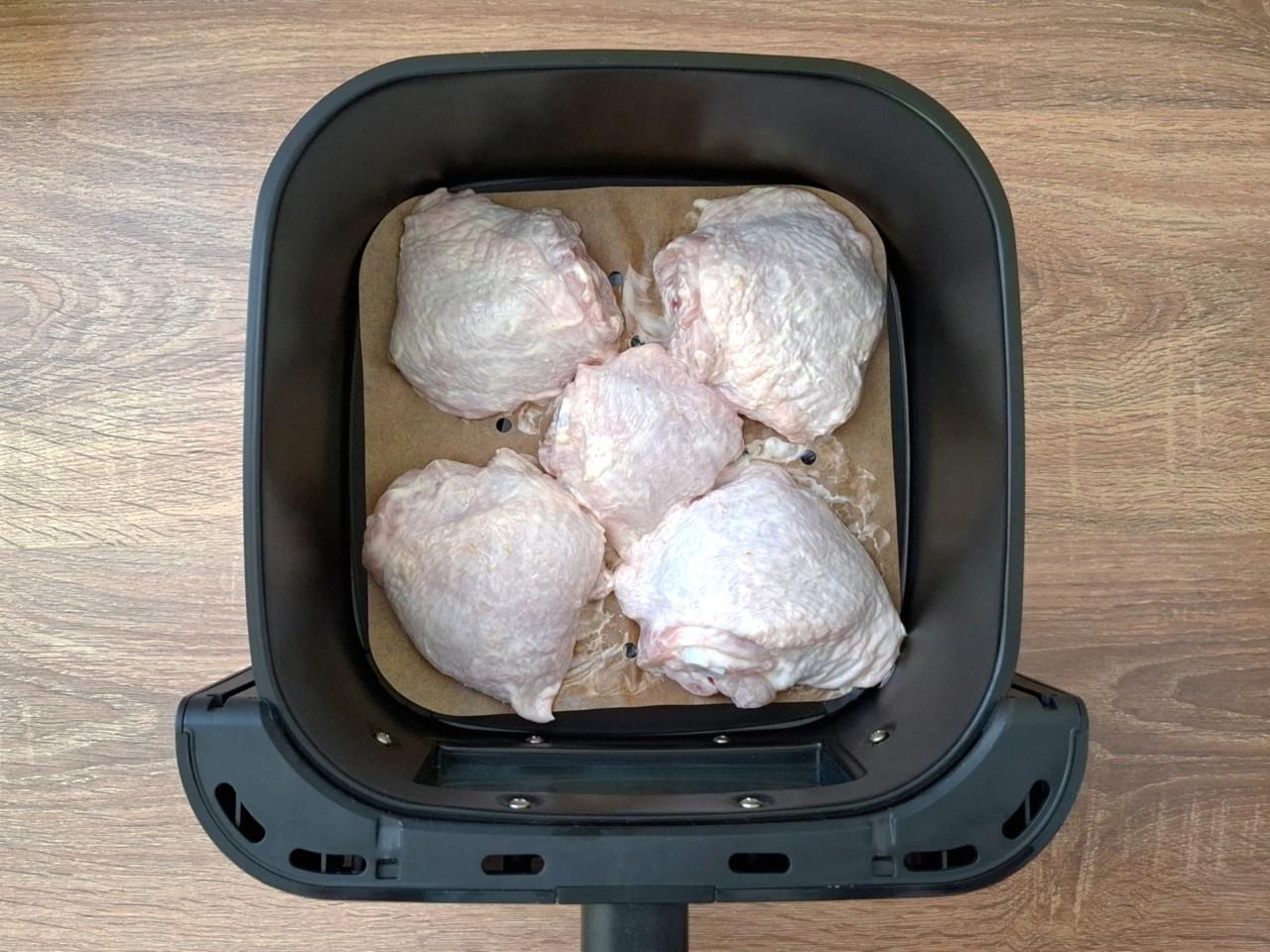 Чашу аэрогриля застелите пергаментом, у меня он с отверстиями. Можно использовать силиконовую форму или выложить курицу на решетку, смазанную растительным маслом. Выложите бедра на небольшом расстоянии друг от друга. Не перегружайте решетку аэрогриля, чтобы горячий воздух мог свободно циркулировать и равномерно пропекать курицу со всех сторон. Подробнее о выборе пергамента читайте в статье по ссылке под шагами.