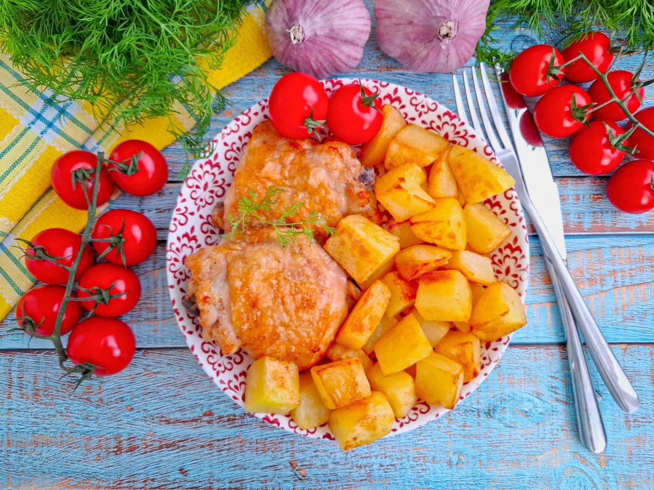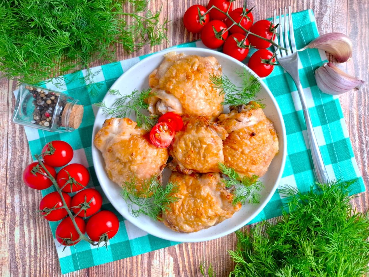 Подавайте горячие куриные бедра сразу после приготовления. Идеально сочетаются с картофельным пюре, рисом, гречневой кашей или свежими овощами. Для яркости вкуса дополните маринованным луком, солеными огурцами или овощным грилем. Украсьте веточками свежей зелени и сбрызните соком, оставшимся после запекания. Приятного аппетита!