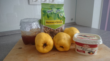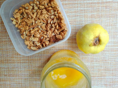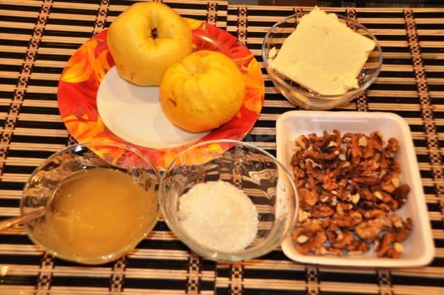 Как сделать запеченную кусочками айву с грецкими орехами - горячий десерт? Подготовьте ингредиенты. Орехи измельчите с помощью блендера, мясорубки или мелко порубите ножом. Если измельчаете ножом, предварительно слегка подсушите орехи на сухой сковороде. Подробнее о выборе сковороды читайте по ссылке под шагами. Поставьте духовку на разогрев до 180 градусов.