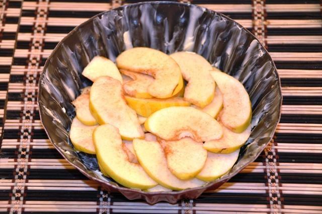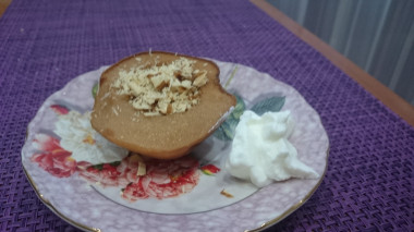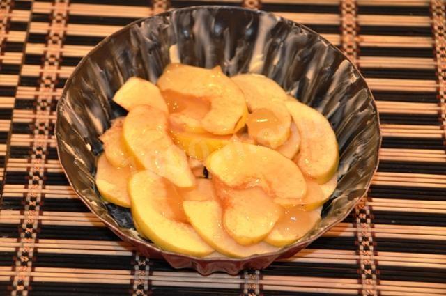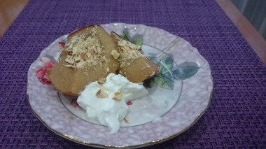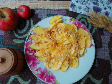 Когда выложила готовые дольки на тарелку полила оставшейся жидкостью и посыпала орешками.