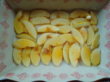 Форму смазала сливочным маслом, выложила порезанную тонкими дольками айву. Сверху полила жидким мёдом. Сахаром не посыпала, сладости айвы и мёда на мой взгляд достаточно.
