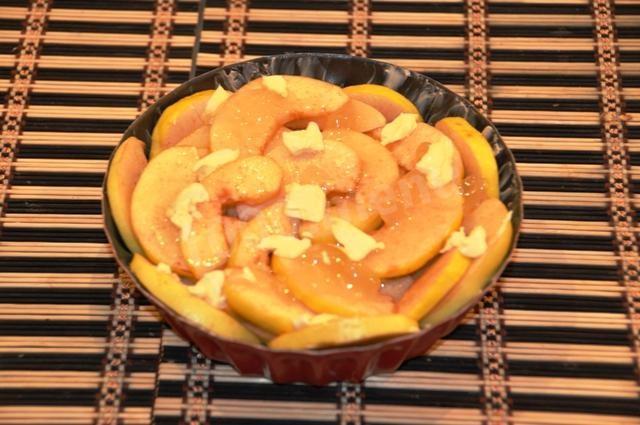 Форму для запекания смажьте сливочным маслом. По желанию можете застелить пергаментом, смазав маслом его поверхность. Уложите кусочки айвы плотно друг к другу.