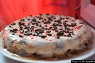Я полила его глазурью и украсила конфетками и тертым шоколадом.