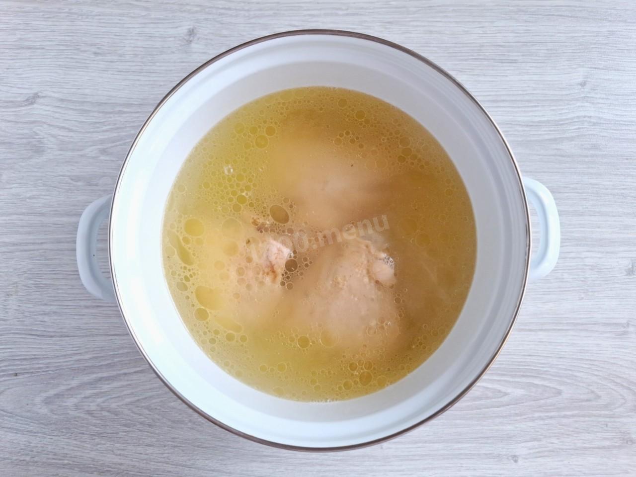 Куриные бёдрышки промойте в холодной воде, выложите в кастрюлю и залейте чистой водой. Я сняла с бёдрышек кожу, чтобы суп получился более диетическим. Доведите до кипения, затем нагрев убавьте до среднего или минимального, пену снимите и посолите по вкусу. Варите около 15-20 минут. Затем курицу достаньте, а бульон процедите через сито. Время варки зависит от особенностей работы вашей плиты и готовности курицы.