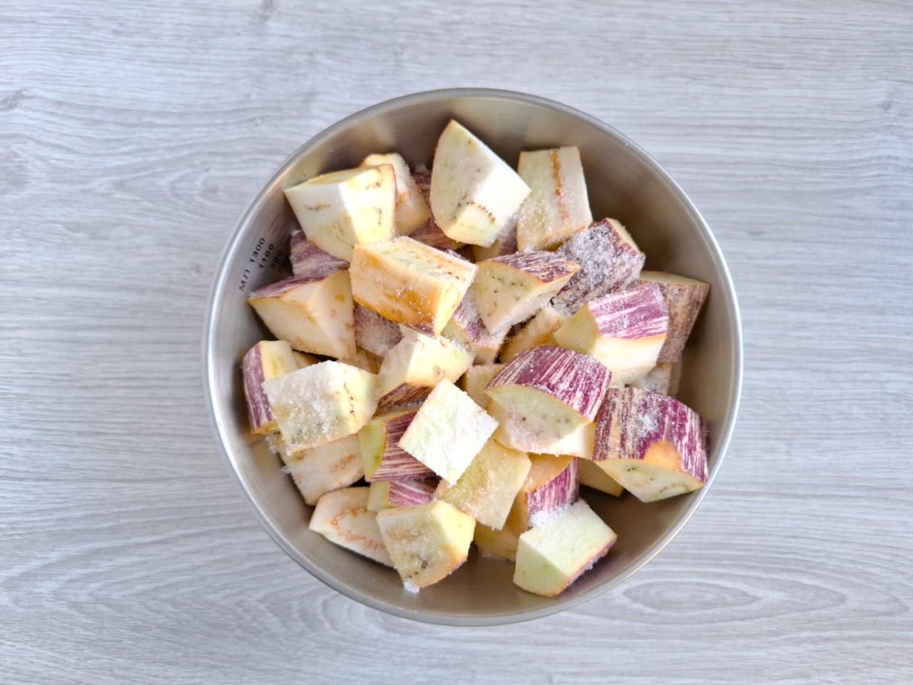 Баклажаны помойте в холодной проточной воде, обсушите бумажным полотенцем и срежьте хвостики. Нарежьте их кусочками толщиной примерно 3-4 см. По желанию можно счистить шкурку. Нарезку присолите, перемешайте и оставьте примерно на 15 минут, чтобы убрать горечь. Затем баклажаны промойте в холодной воде и слегка отожмите. Учитывайте, что некоторые сорта баклажанов не горчат.