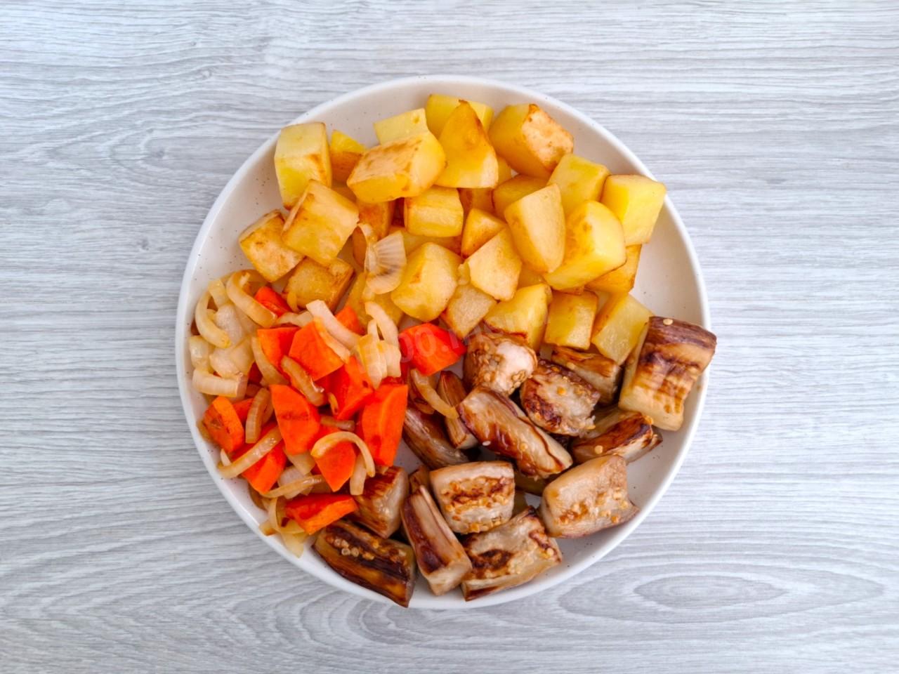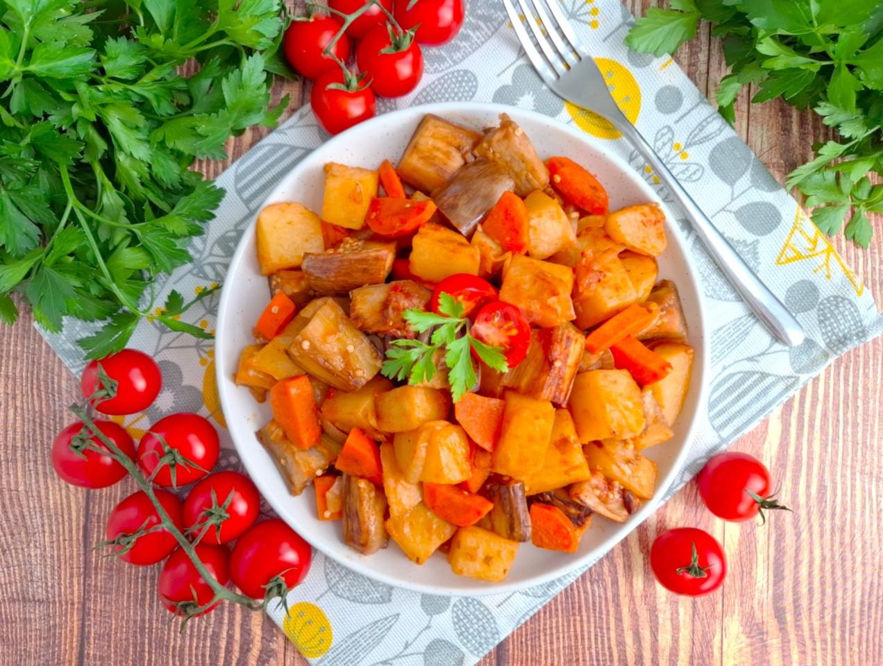 Разогрейте растительное масло в сковороде на среднем огне. Обжарьте кусочки баклажанов до золотистой корочки, затем выложите их на тарелку. Следом обжарьте картошку и отдельно лук с морковью. Время обжаривания (около 5-10 минут) зависит от работы вашей плиты и готовности овощей. Они должны покрыться румяной корочкой, но оставаться целыми. С выбором сковороды и масла для жарки вам помогут статьи под рецептом.