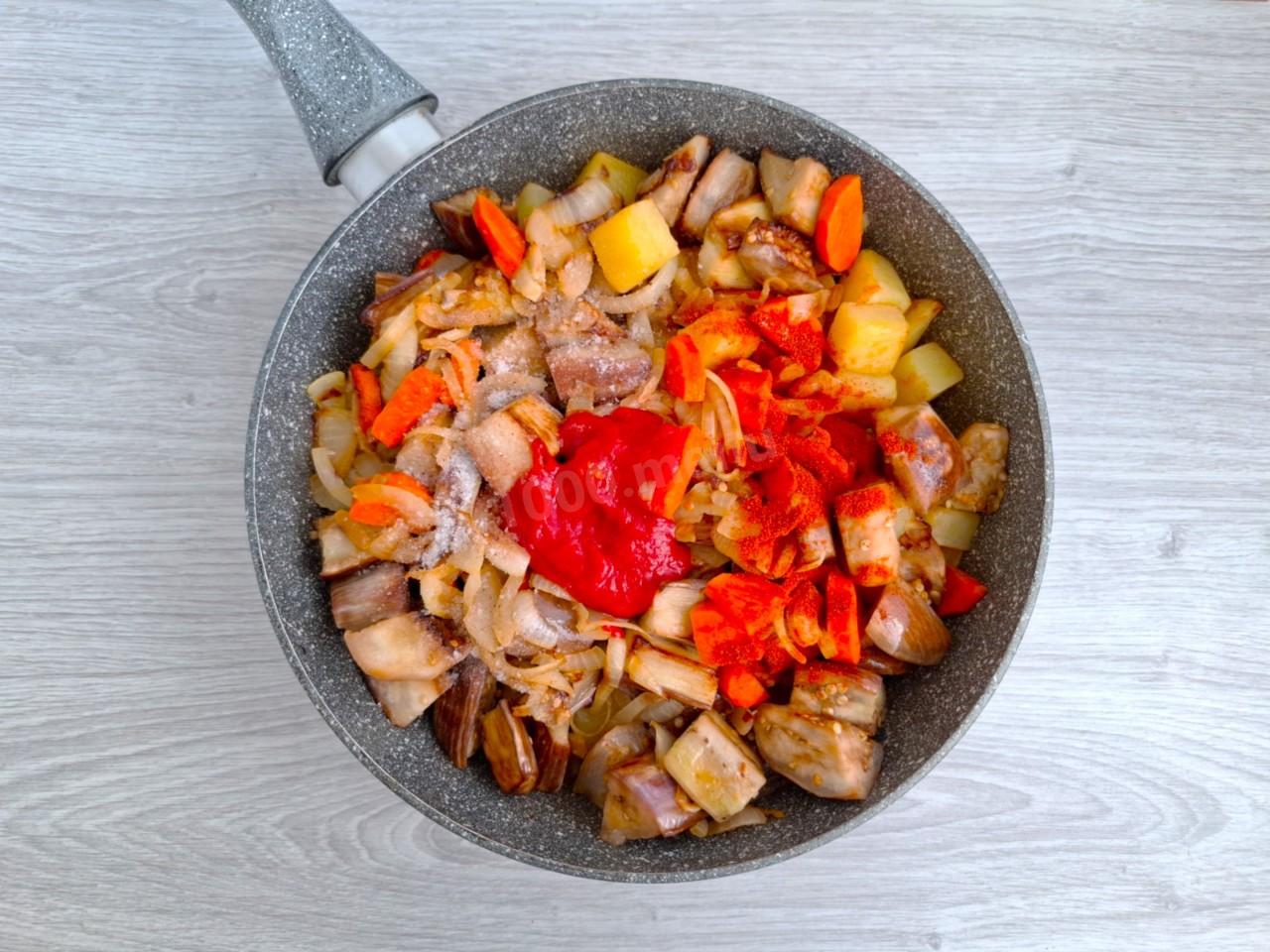 Соедините все овощи в сковороде, добавьте томатную пасту, паприку, соль и перец по вкусу. Можете использовать любые специи на свой вкус и выбор. Влейте в сковороду немного кипяченой горячей воды и аккуратно перемешайте. Накройте сковороду крышкой и тушите при небольшом нагреве около 15 минут. Время зависит от работы вашей плиты и готовности блюда. С выбором сковороды и масла для жарки помогут статьи под рецептом.