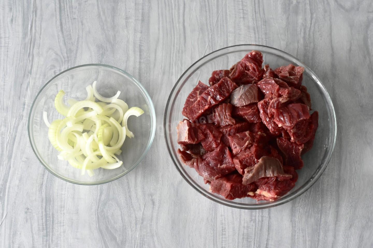 Шаг 2. Как подготовить и нарезать говядину и лук?