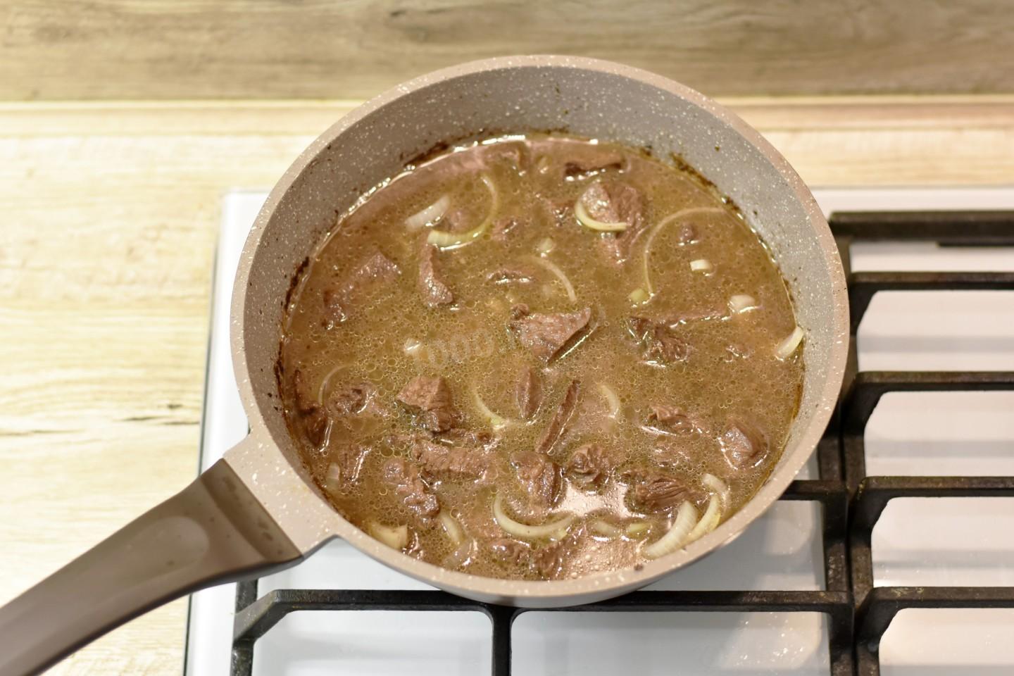 Добавьте лук и жарьте все вместе, помешивая, еще 2-3 минуты. Затем влейте в сковороду горячий мясной бульон и доведите его до кипения.