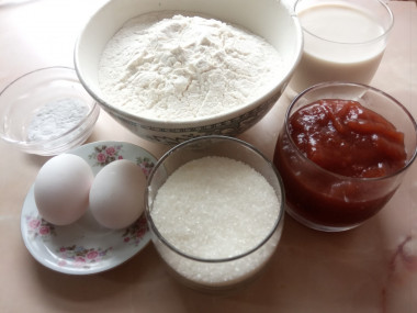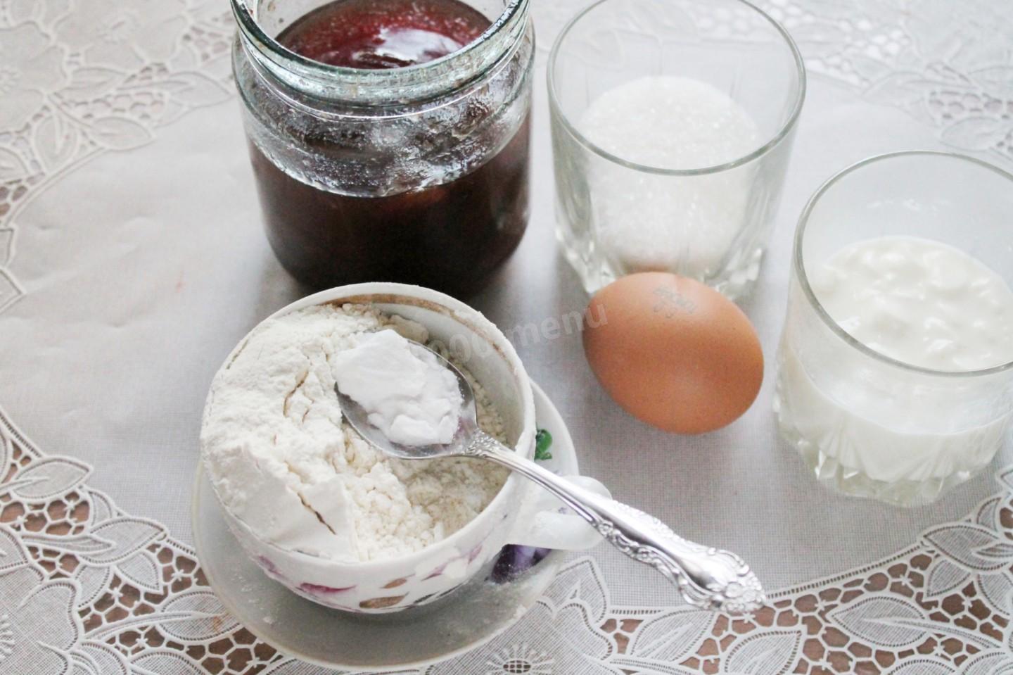 Как испечь пирог на кефире со сметанным кремом? Возьмите набор продуктов по списку. Варенье можете брать любое, даже жидкое, из любых ягод или фруктов (может, даже овощей). Проследите, чтобы в нем не было косточек. У меня сливовое. Только вот если возьмете черносмородиновое или черничное, то тесто окрасится в неприглядный серо-зеленоватый цвет, имейте это в виду.