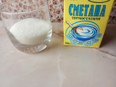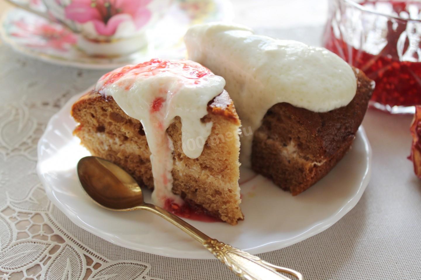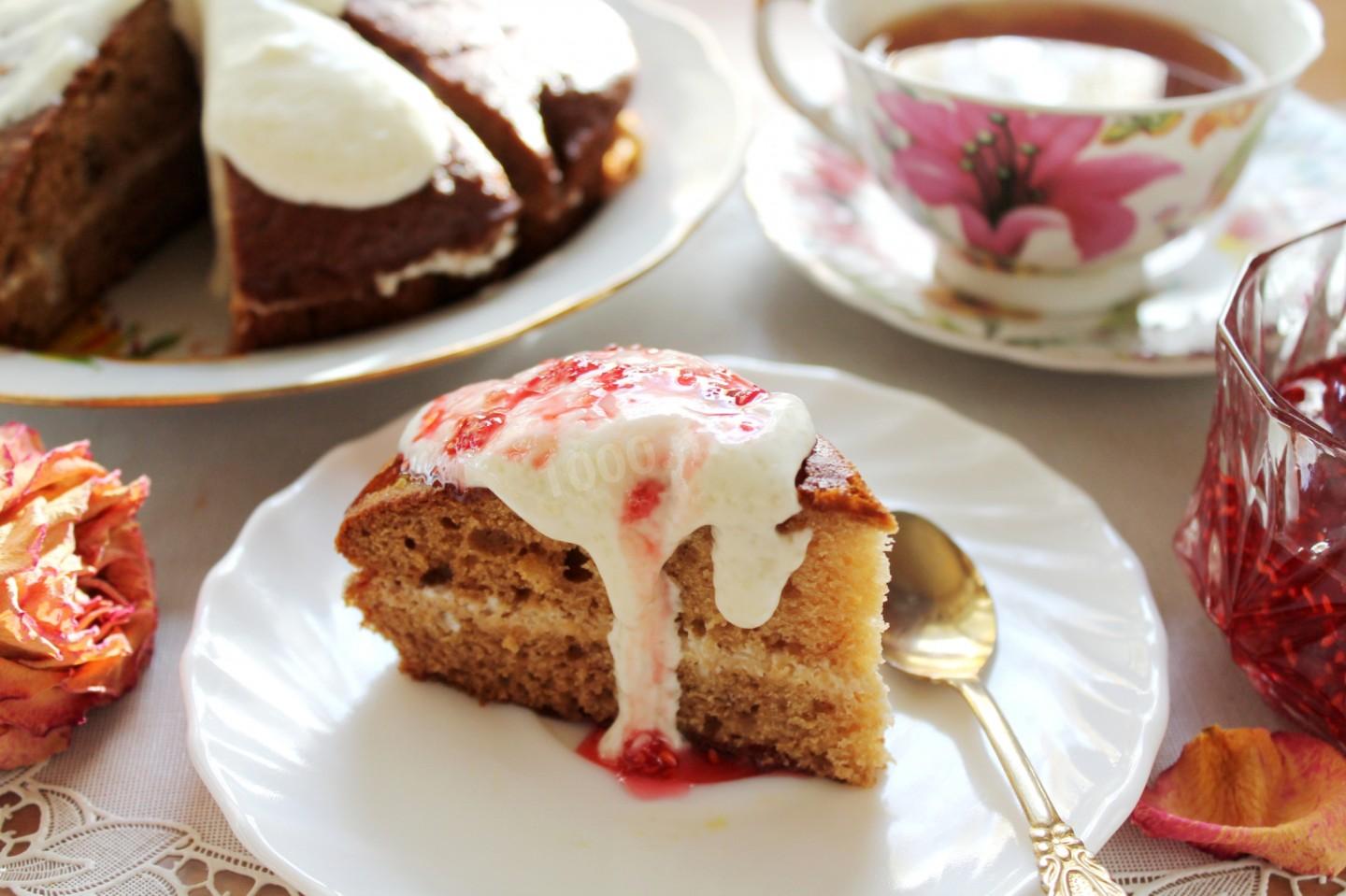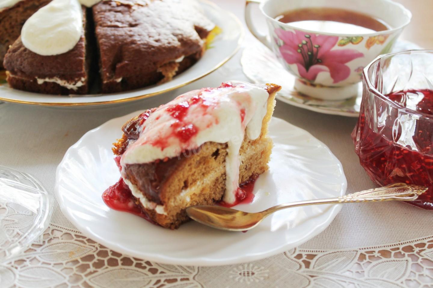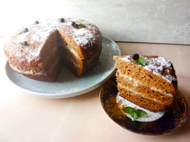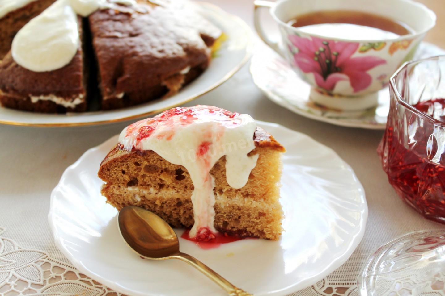 Смажьте коржи сметанным кремом - произвольно смешайте сметану с сахаром и хорошо взбейте. Подавайте пирог к чаю.