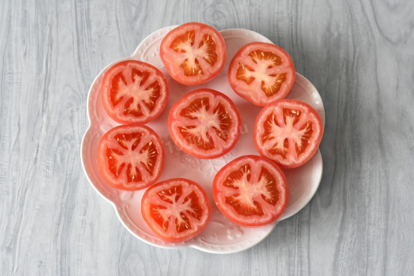 Помидоры выбирайте сочные, но плотные. Мягкие плоды плохо держат форму, в процессе нарезки и приготовления они расползутся в бесформенную массу и испортят внешний вид блюда. Помидоры вымойте, обсушите и разрежьте пополам. Если половинки неустойчивы, подравняйте их снизу.