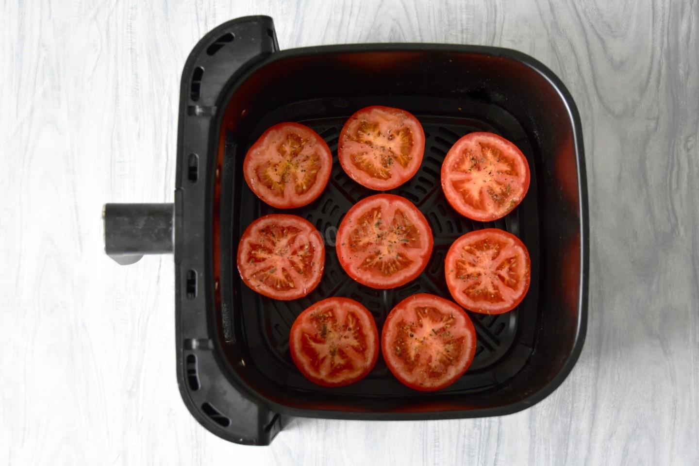 Запекайте помидоры 7-8 минут при 180℃. Точное время и температура зависят от ваших продуктов и техники. Более подробная информация об особенностях запекания в аэрогриле есть в конце рецепта под шагами.