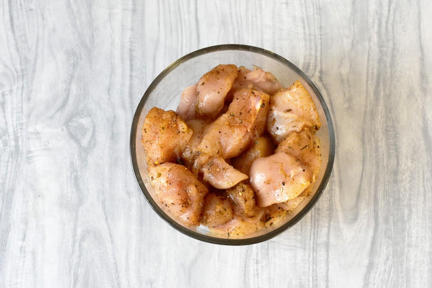 Куриное филе вымойте, обсушите и нарежьте средними кусочками. Курицу посыпьте специями для курицы, солью и перцем и перемешайте. Оставьте мариноваться на 20 минут. Филе можете брать с грудки или бедра птицы. Какое мясо можно брать помимо курицы? Любое. Подойдет индейка, говядина или свинина. Но при этом учитывайте, что изменится калорийность и время приготовления блюда.
