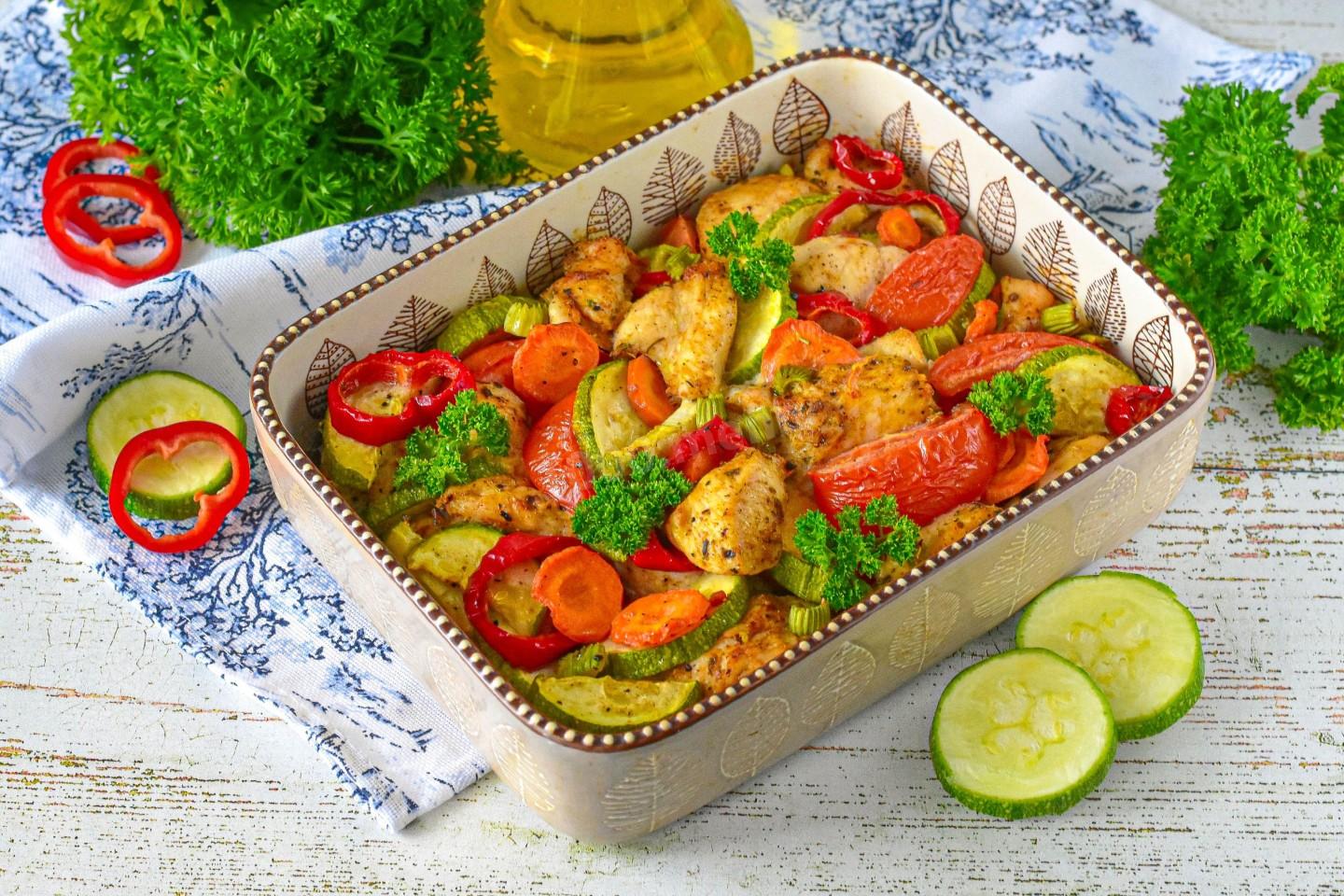 Кабачок вымойте, обсушите и нарежьте полукольцами. Помидор вымойте, обсушите и нарежьте дольками. Морковь очистите и нарежьте кольцами или полукольцами. Сладкий перец нарежьте кусочками. Сельдерей промойте и нарежьте средними кусочками. В миске соедините кабачок, сладкий перец, помидоры, морковь и сельдерей. Овощи полейте растительным маслом, посыпьте солью и молотым перцем и перемешайте. В форму для запекания выложите овощи и курицу.
