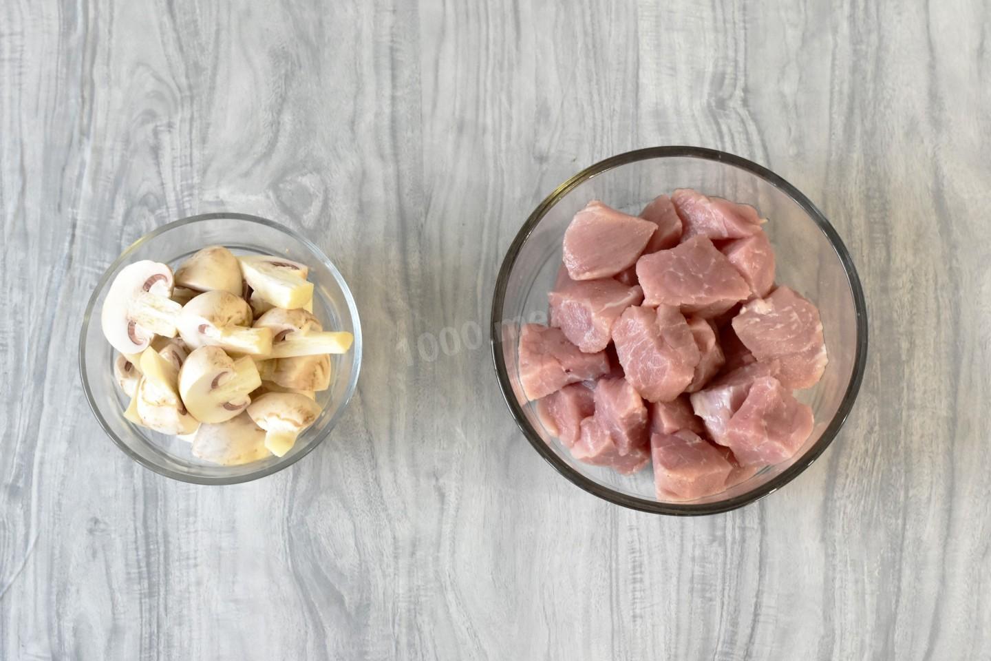 Свинину вымойте, обсушите и нарежьте средними кусочками. Я взяла нежирный окорок. Можете также брать другие части свинины, например, шею, лопатку, вырезку. О том, какие части свинины выбрать и какие специи подобрать, читайте в статьях по ссылкам в конце рецепта. Грибы вымойте и обсушите. Мелкие грибочки оставьте целиком, средние и крупные нарежьте половинками или четвертинками. Шампиньоны можете заменить другими грибами по вашему вкусу.