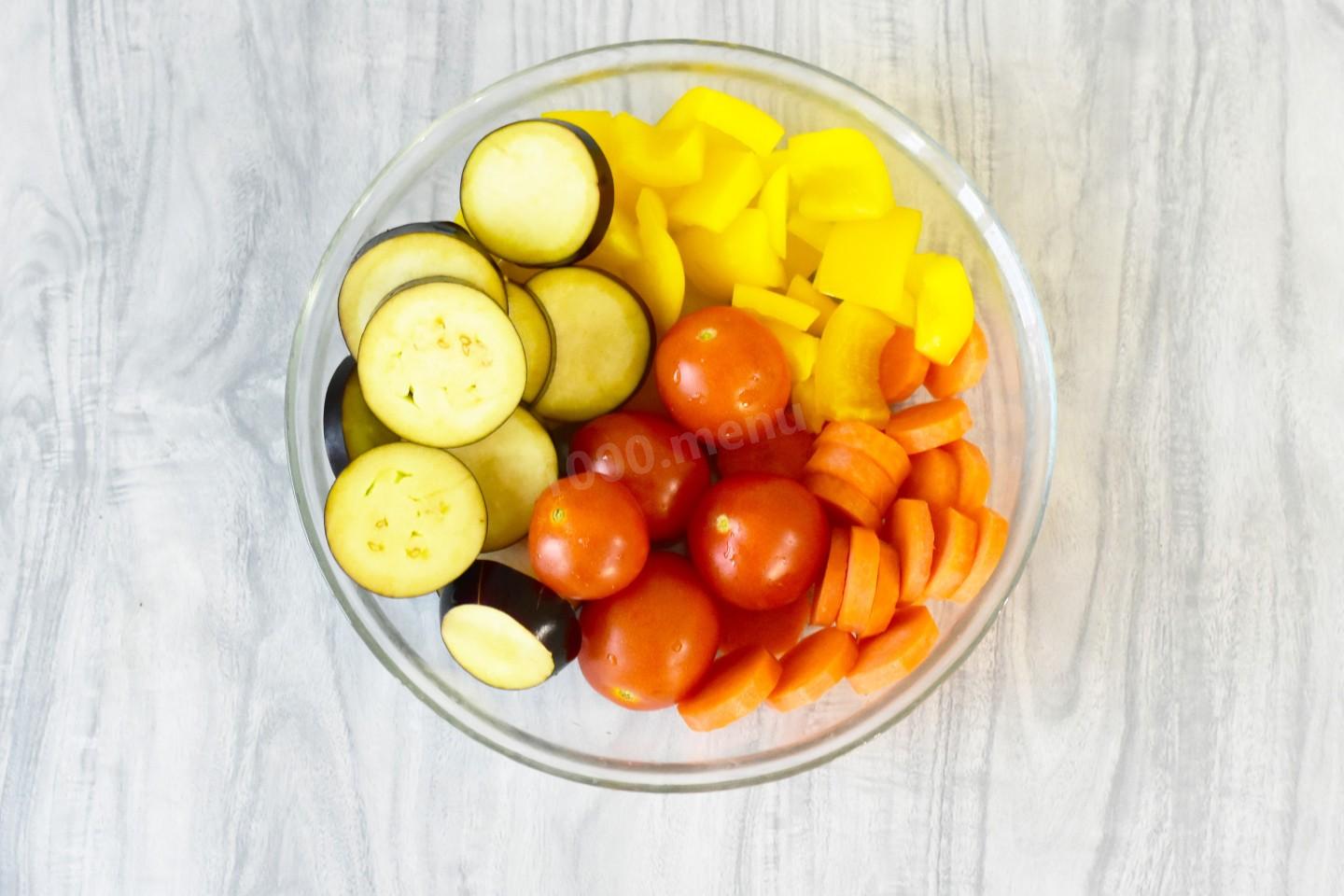 Тем временем подготовьте остальные овощи. Баклажан вымойте, обсушите бумажным полотенцем и нарежьте средними кусочками. Морковь очистите ножом или овощечисткой, помойте, обсушите и нарежьте колечками или полукольцами. Сладкий перец очистите от семян и белых перегородок, помойте и обсушите, нарежьте средними кусочками. Помидоры черри вымойте и обсушите. Я оставила томаты целыми, вы можете нарезать по желанию.