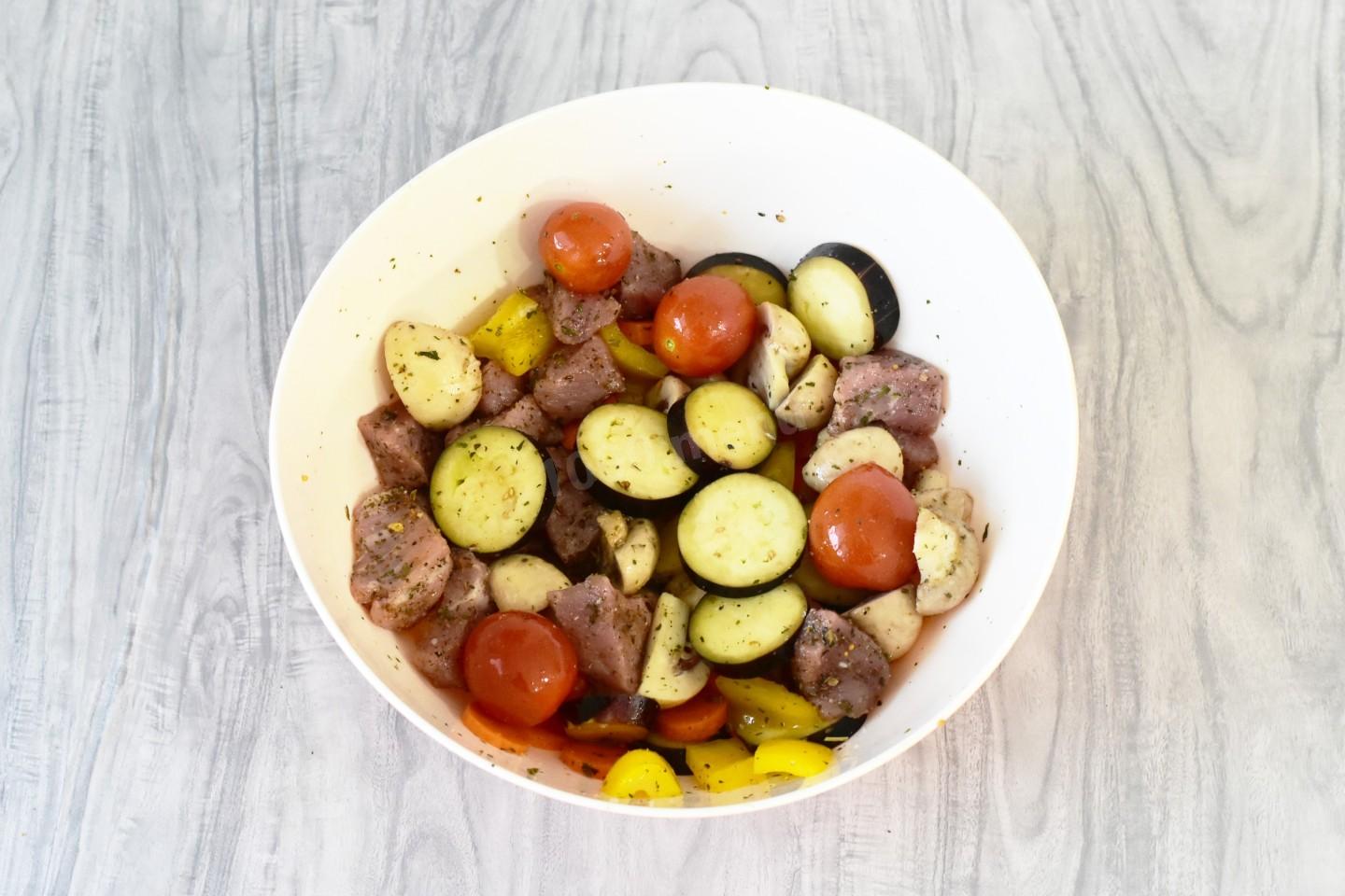 К свинине добавьте нарезанные овощи и грибы. Влейте растительное масло, при необходимости добавьте еще специй и перемешайте. Оставьте мариноваться еще на 30 минут. С выбором масла вам поможет статья под рецептом.