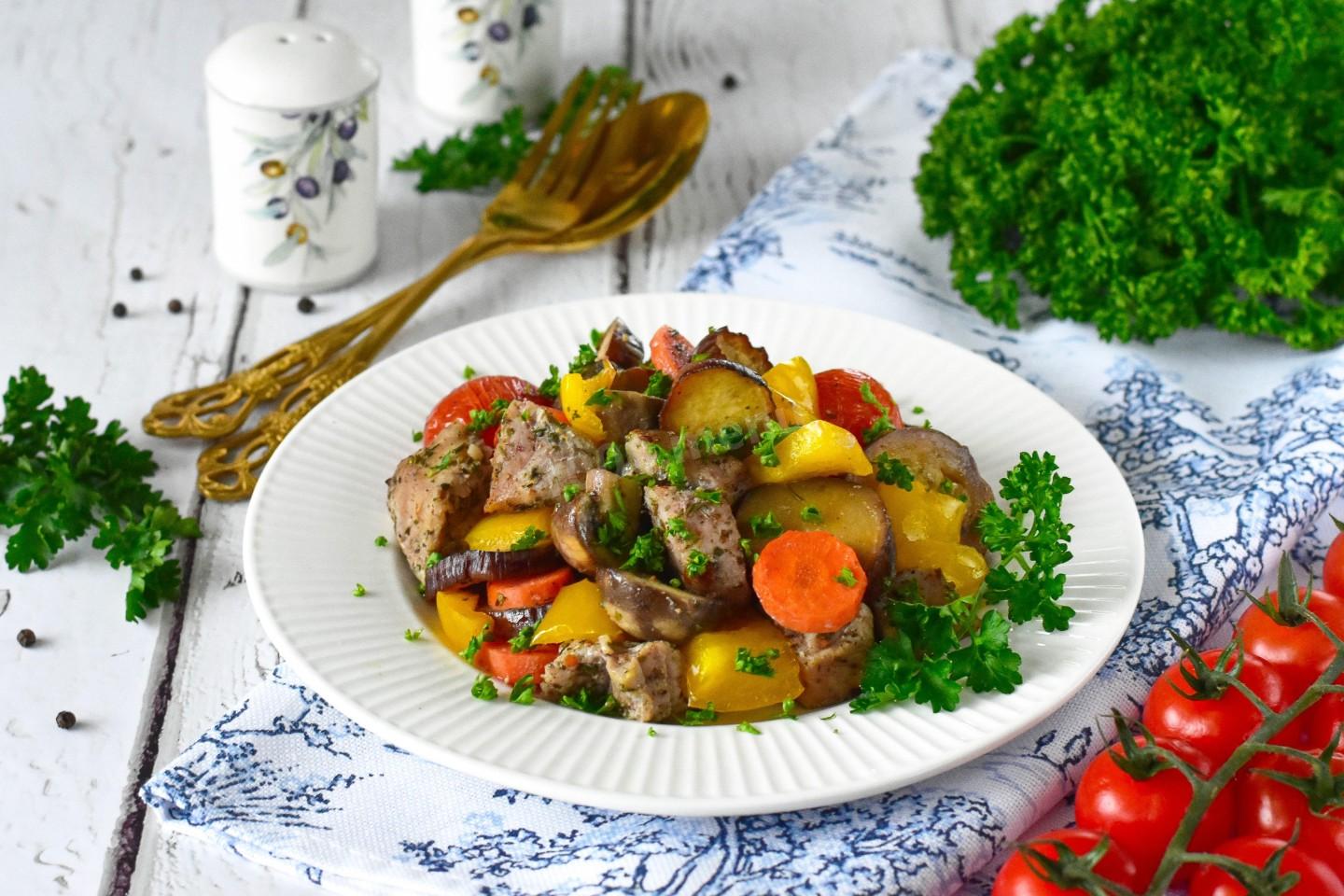 Аэрогриль готовит в разы быстрее духовки за счет мощной циркуляции горячего воздуха. Блюдо «Мясо с овощами» в нем получается менее калорийным, так как излишки жира стекают в поддон. Орегано и черный перец - классическая пара для свинины, раскрывающая ее вкус.