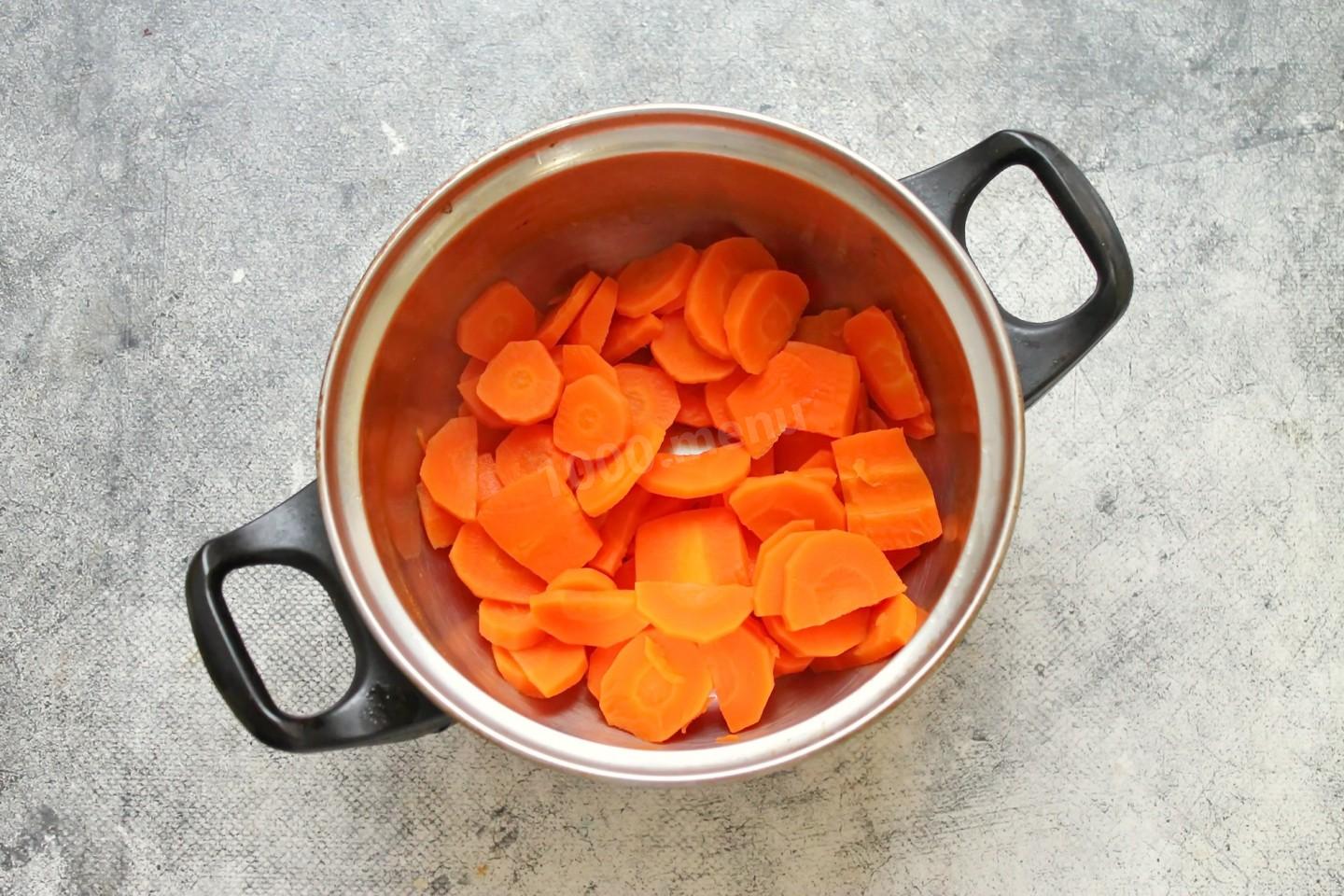 Морковь почистите, вымойте, порежьте на кружочки. Положите морковь в кастрюлю с толстым дном, влейте воду, она должна полностью покрыть морковь и быть выше на 1-2 сантиметра. Какая кастрюля лучше всего подойдет можно прочитать по ссылке под рецептом. Поставьте на средний огонь, доведите все до кипения и варите на среднем огне в течение 15-20 минут. Морковь должна полностью свариться и стать мягкой. Откиньте морковь на сито и дайте отвару полностью стечь.