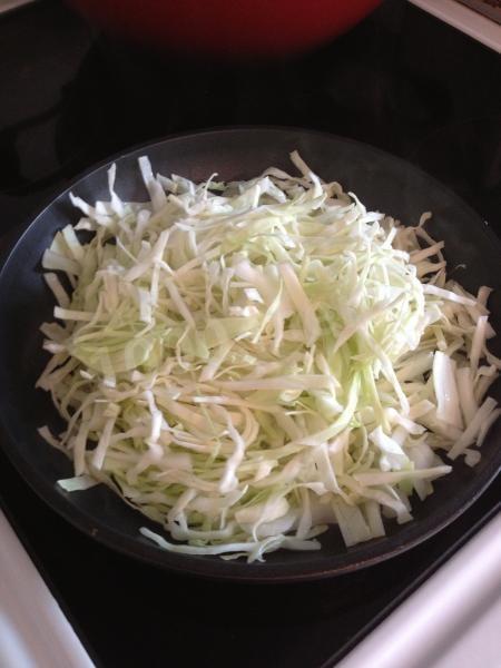 Капусту нашинковать и начать обжаривать на растительном масле под крышкой.