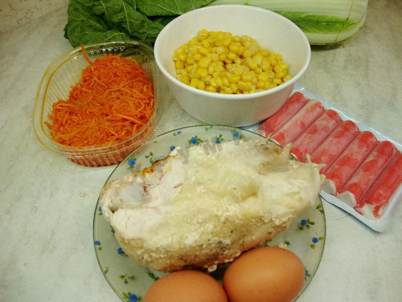 Как сделать салат с крабовыми палочками курицей и кукурузой?Подготовить все ингредиенты