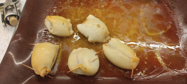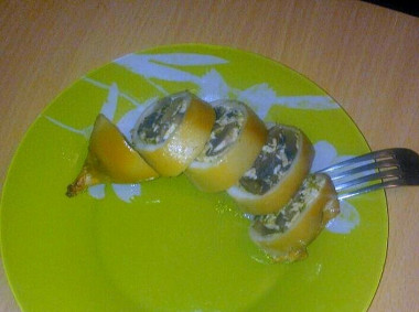 Готовила такие кальмары, получается очень вкусно, главное не переборщить с начинкой когда фаршируешь, а то я по доброте душевной плотненько так нафаршировала, а после запекания часть начинки собирала с противня, но все равно было очень вкусно