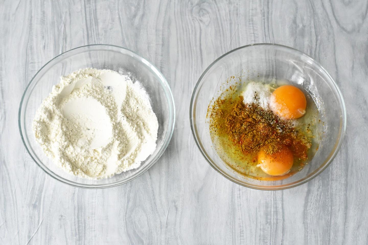 В одной миске муку смешайте с щепоткой соли и перца. В другой миске соедините яйца, специи для курицы, соль и перец по вкусу и взбейте вилкой до однородности. Если вы используете готовые смеси специй, обязательно прочитайте на упаковке состав. Часто в таких смесях уже присутствуют соль и перец, учитывайте это, иначе рискуете пересолить и переперчить блюдо.