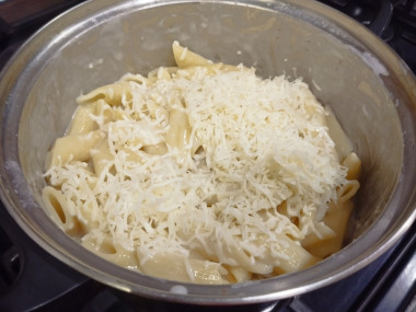 Когда молоко впитается, добавьте к горячим макаронам сливочное масло, перемешайте, чтобы оно распределилось равномерно. Сливочное масло возьмите натуральное, без заменителей молочных жиров.
