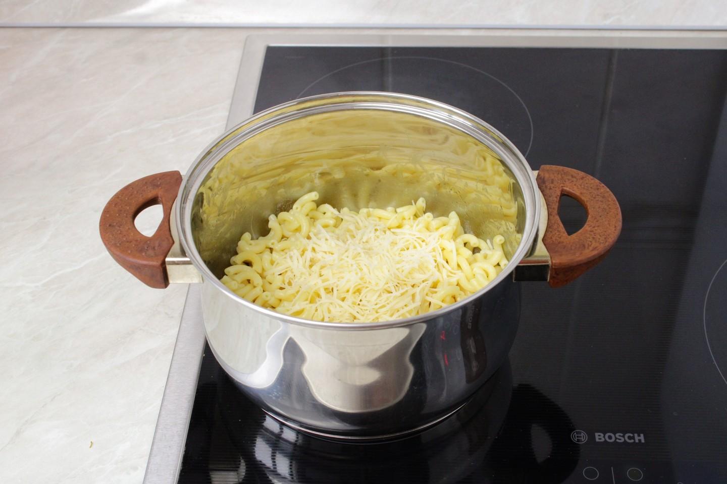 Сыр натрите на мелкой или крупной терке. Сыр можно взять твердый или полутвердый. Главное, чтобы он вкусным, качественным, без заменителей молочных жиров и хорошо плавился. Добавьте в блюдо тертый сыр, перемешайте, чтобы он полностью расплавился. Всё о работе с тёркой читайте в статье под шагами.