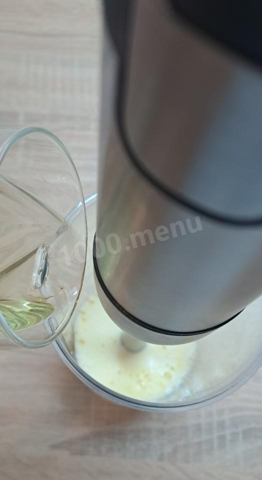 Затем, не выключая блендер, вливаем тонкой струйкой растительное масло. При этом блендер не выключаем и начинаем водить им вверх, вниз, взбивая майонез. Очень скоро вы увидите, что масса белеет и начинает густеть. Блендер не выключаем! Взбиваем! Густота майонеза зависит от количества растительного масла, чем его больше, тем гуще майонез будет. Как только вас будет устраивать густота майонеза, то перестаем добавлять растительное масло и блендер выключ