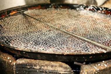 Итак, нам нужна рисовая мука, из которой мы замешиваем жидкое тесто, постепенно добавляя в него 120 мл воды. Потом с помощью специальной воронки с отверстиями тесто выливаем на горячий противень и выпекаем своеобразную сеткообразную ришту.