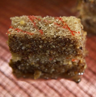 Начинку для теста делаем так. Измельчаем орехи и добавляем семена кинзы и толченый кардамон. Затем в смазанный маслом противень укладываем 8 слоев рисовой ришты. На эти слои ровненько наносим слой начинки, сверху помещаем еще 5 слоев ришты и придаем халве круглую форму. Всю конструкцию сверху украшаем шафраном. Затем 15-20 минут выпекаем над раскаленными углями с двух сторон. После этого готовим сироп. В 100 мл воды добавляем сахар и лимонную кислоту. Заливаем халву горячим сиропом и оставляем на 8 -10 часов, чтобы она хорошенько пропиталась им.