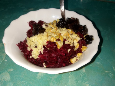 Очень люблю этот салат, но в э тот раз решила его сделать без орешков. Свеклу и чернослив порезала соломкой, а чеснок маленьким кубиком. Соль не добавляю совсем, так как хватает её от майонеза. Получилось очень нежно.