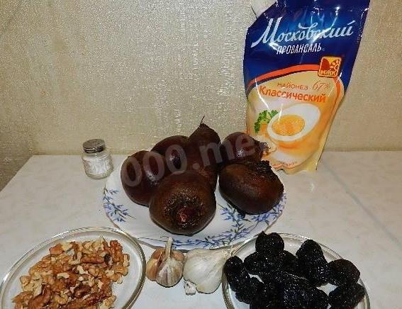 Как сделать Свекольный салат с грецкими орехами черносливом и майонезом? Подготовьте все необходимые ингредиенты. Лучше выбирать свеклу сладких сортов, чтобы вкус салата был ярче.