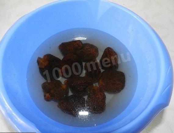 Чернослив нужно залить кипятком и поставить на некоторое время для набухания, затем слейте воду и обсушите на бумажных салфетках. Чернослив нарежьте мелко.