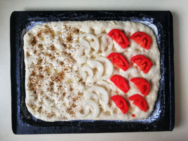 Когда тесто подошло, выложила его на противень и распределила по всей поверхности руками. Получился тонкий пласт. Сделала на нем пальцами ямки, тщательно смазала растительным маслом, выложила помидоры, лук, посыпала итальянскими травами. Пекла хлеб в духовке при температуре 220°. Достала из печки, когда фокачча зарумянилась.
