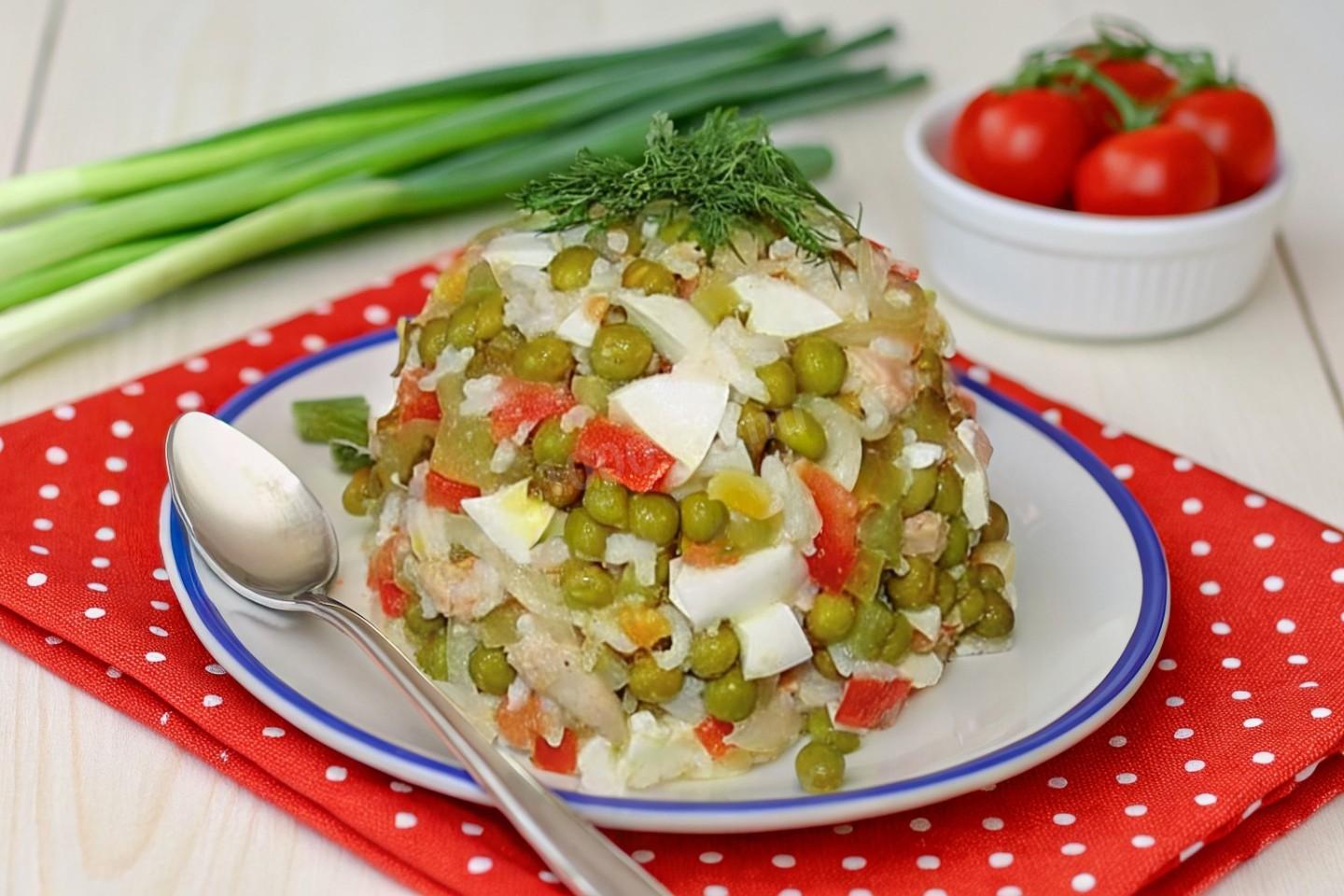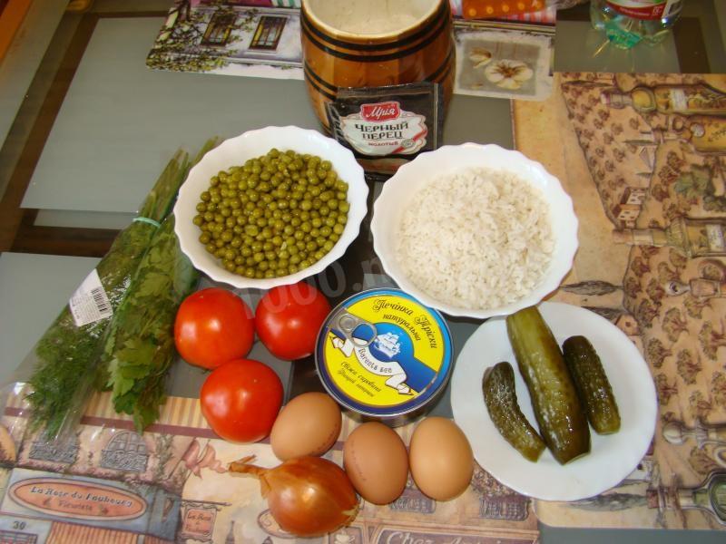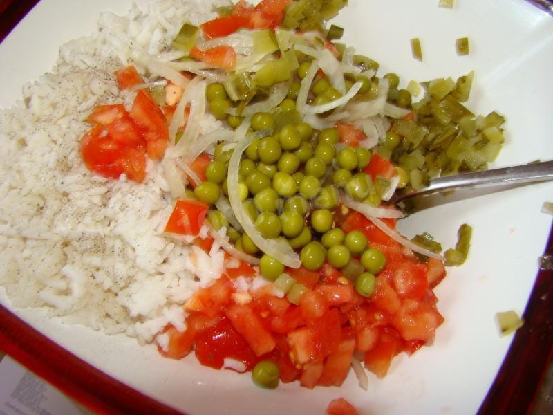 Как сделать салат из печени трески с помидорами и зеленым горошком? Отварите рис до готовности, но не переваривайте его. Рисинки должны остаться целыми. Откиньте на дуршлаг и охладите холодной водой.