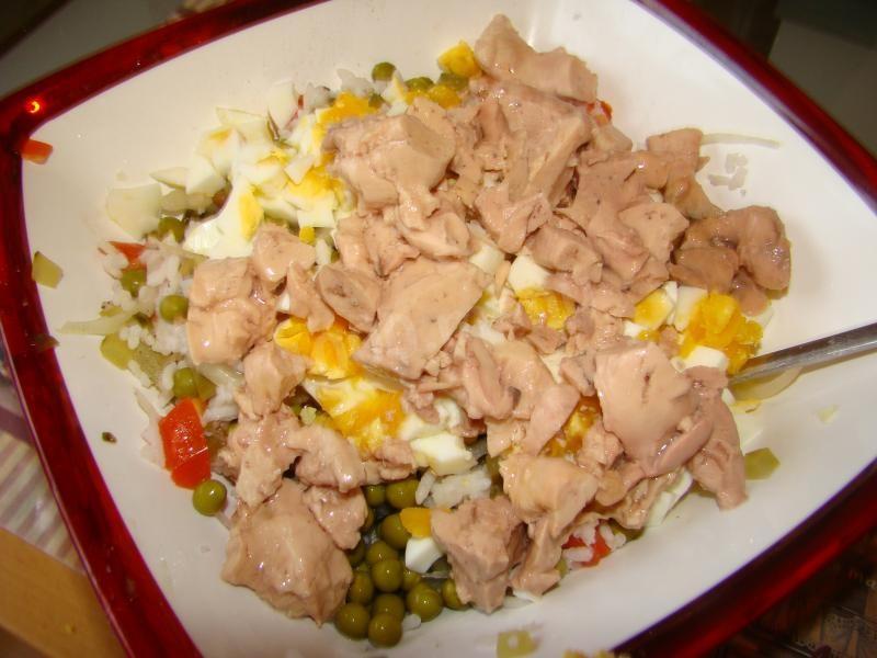 Яйца и печень трески мелко порубите. В миску добавьте зеленый горошек без жидкости и вареный рис.