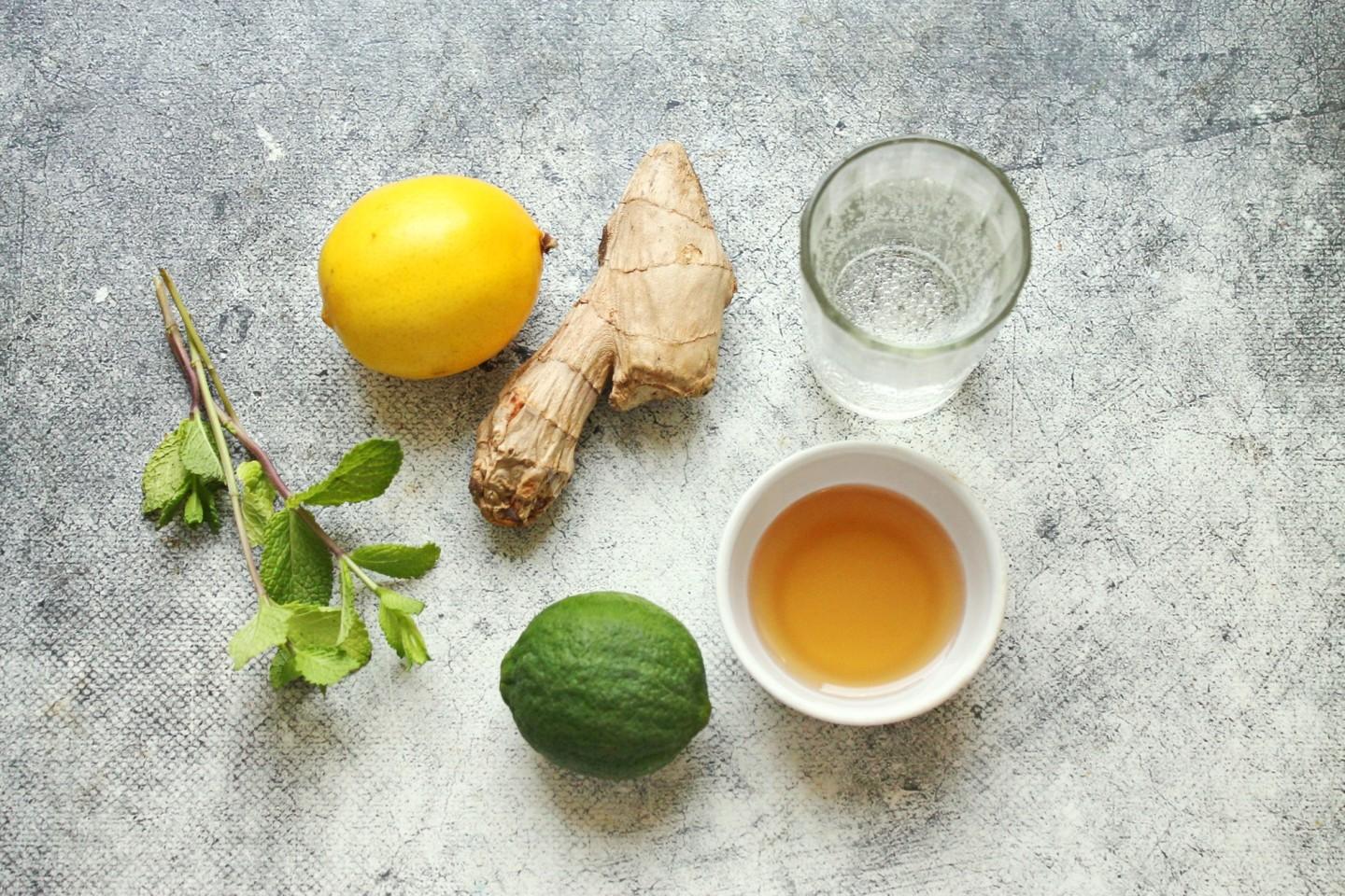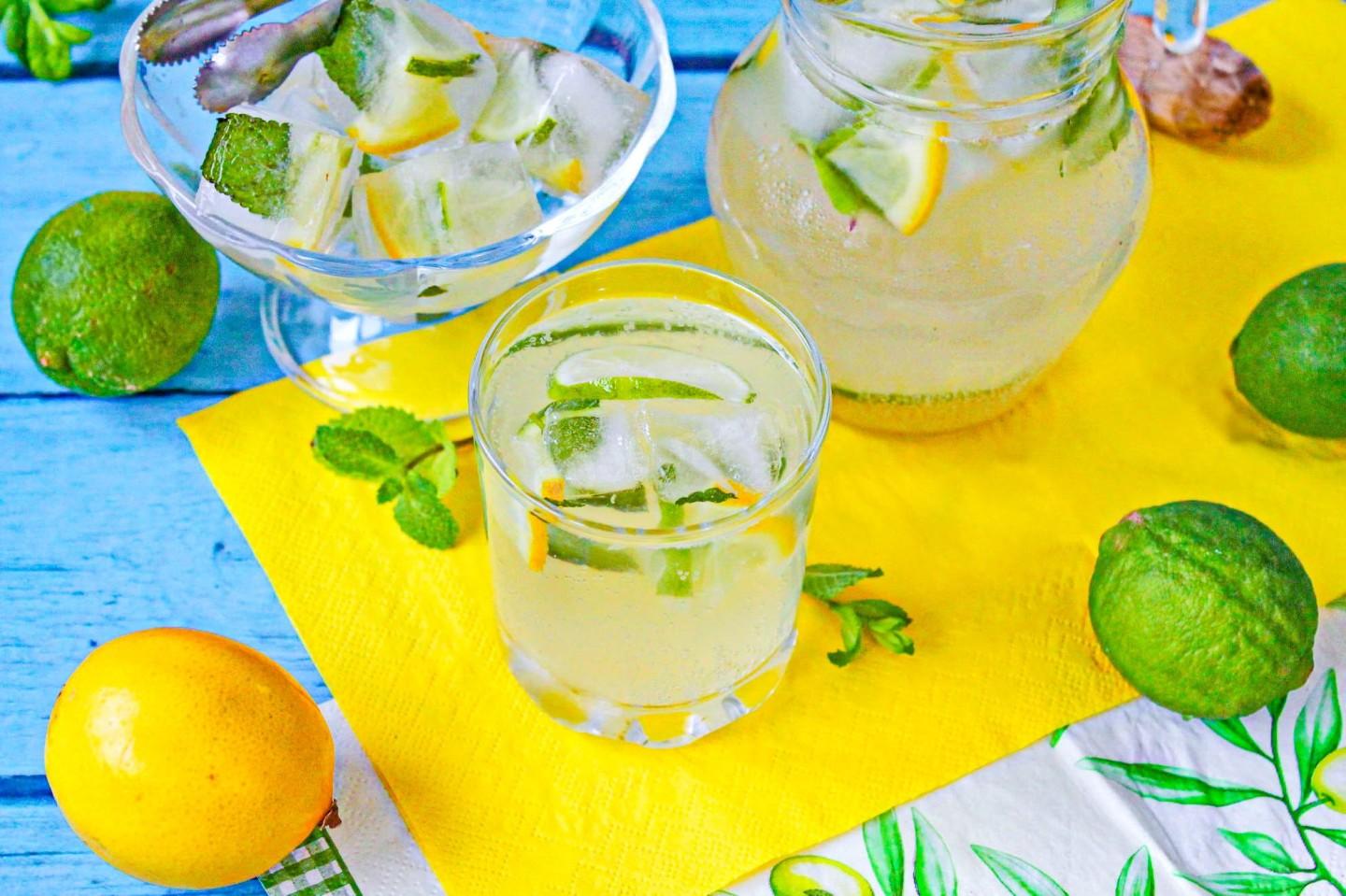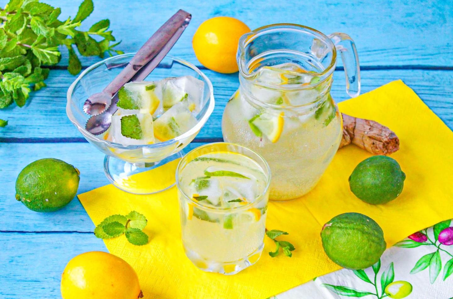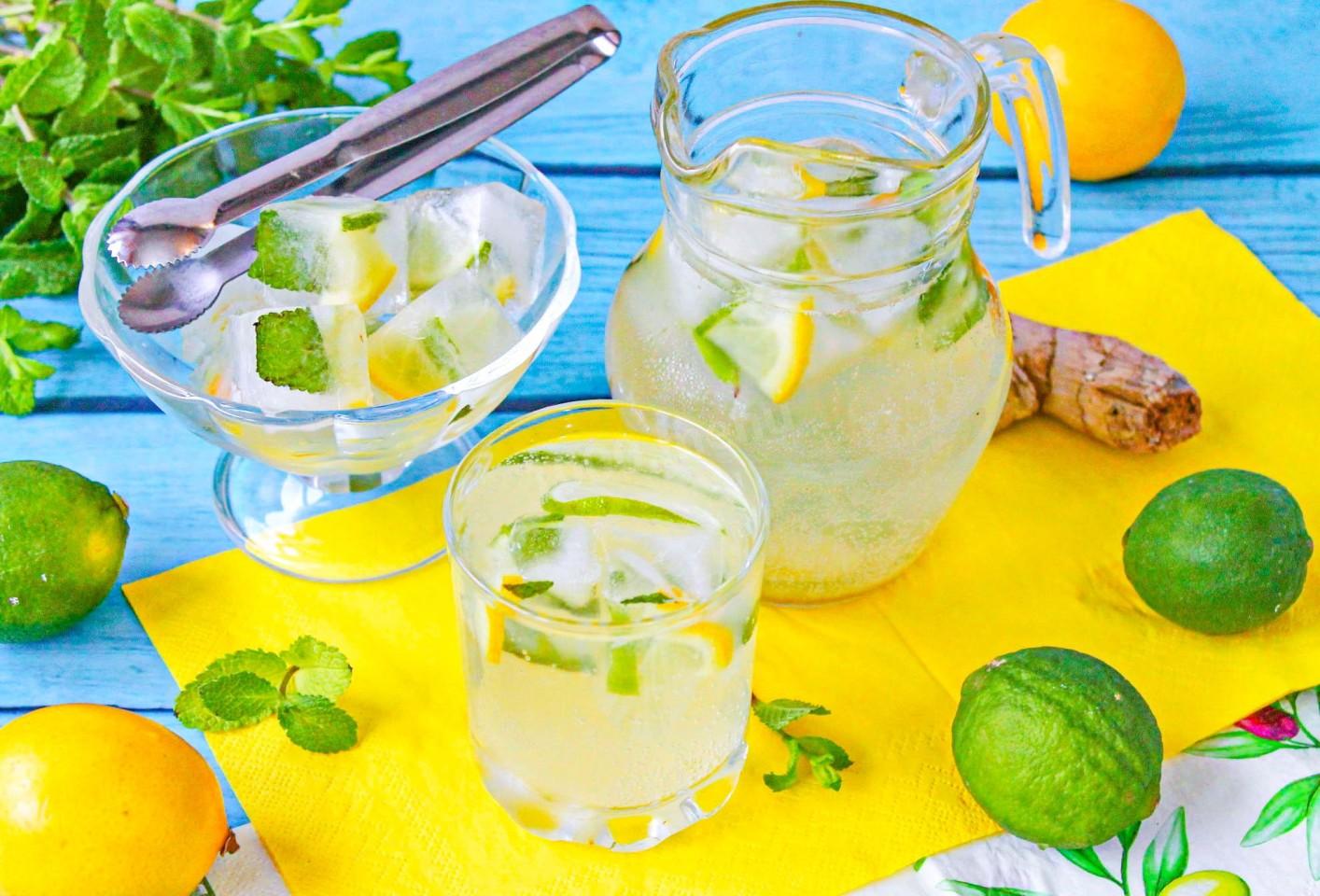 Подготовьте все необходимые ингредиенты. Напиток делается очень быстро, если не считать время на замораживания льда. Лимон, лайм и свежий имбирь тщательно вымойте с мягкой щеточкой и пищевой содой в теплой воде, вытрите.