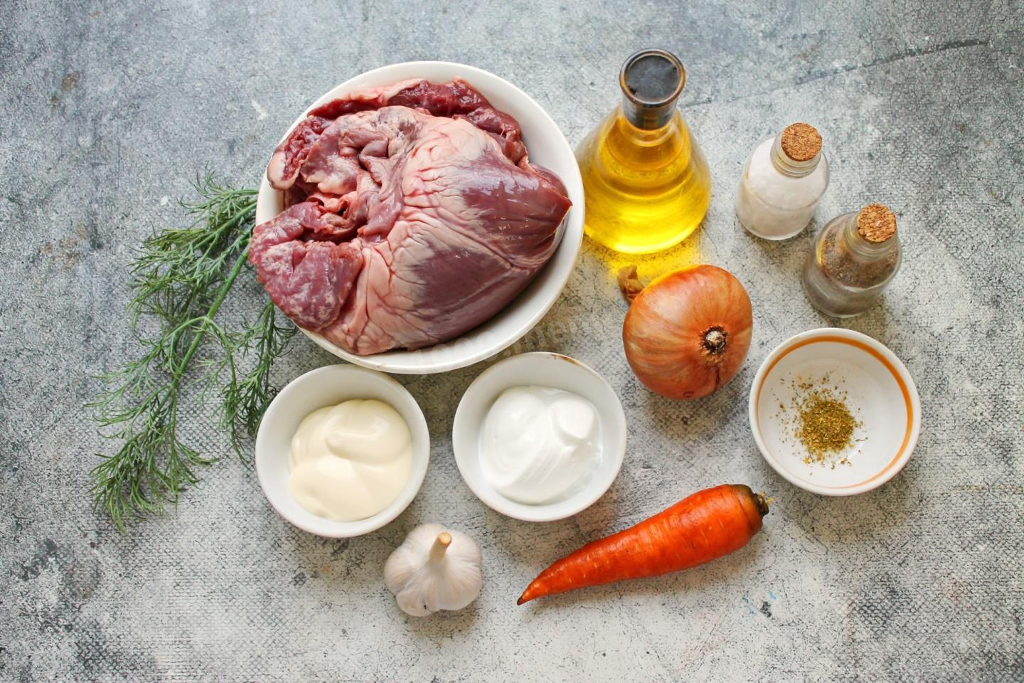 Подготовьте все необходимые ингредиенты для приготовления. Овощи тщательно вымойте под проточной водой, очистите и ополосните. Свиное сердце заранее достаньте из морозилки и разморозьте. О правильной разморозке читайте материал по ссылке в конце рецепта.
