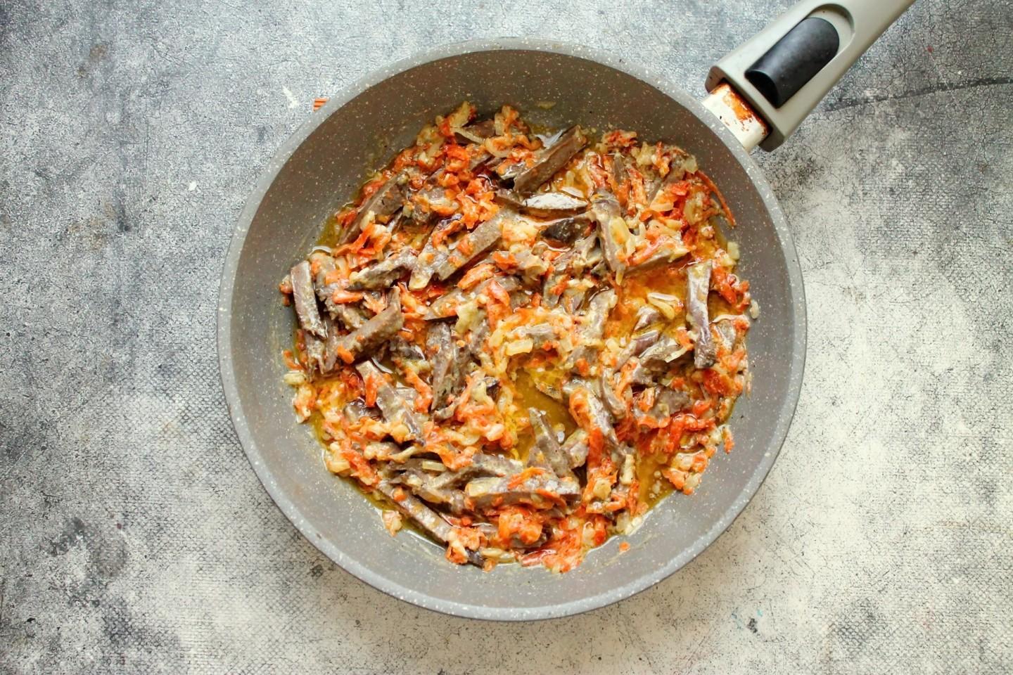 Репчатый лук и чеснок мелко порежьте. Морковь натрите на крупной терке и добавьте в сковороду вместе с луком и чесноком к сердцу. Обжарьте все на среднем огне в течение примерно 15 минут, до мягкости овощей, помешивая. А все тонкости работы с привычной кухонной теркой - в статье по ссылке под шагами.