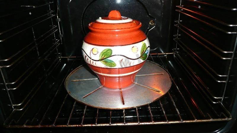 Поставьте горшочек в духовку и варите суп. Горох варится очень долго. У меня он разваривался 2 часа и еще около часа остывал в духовке.