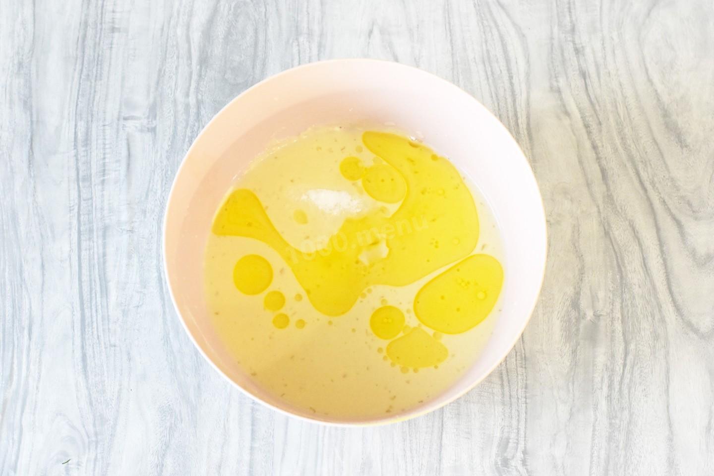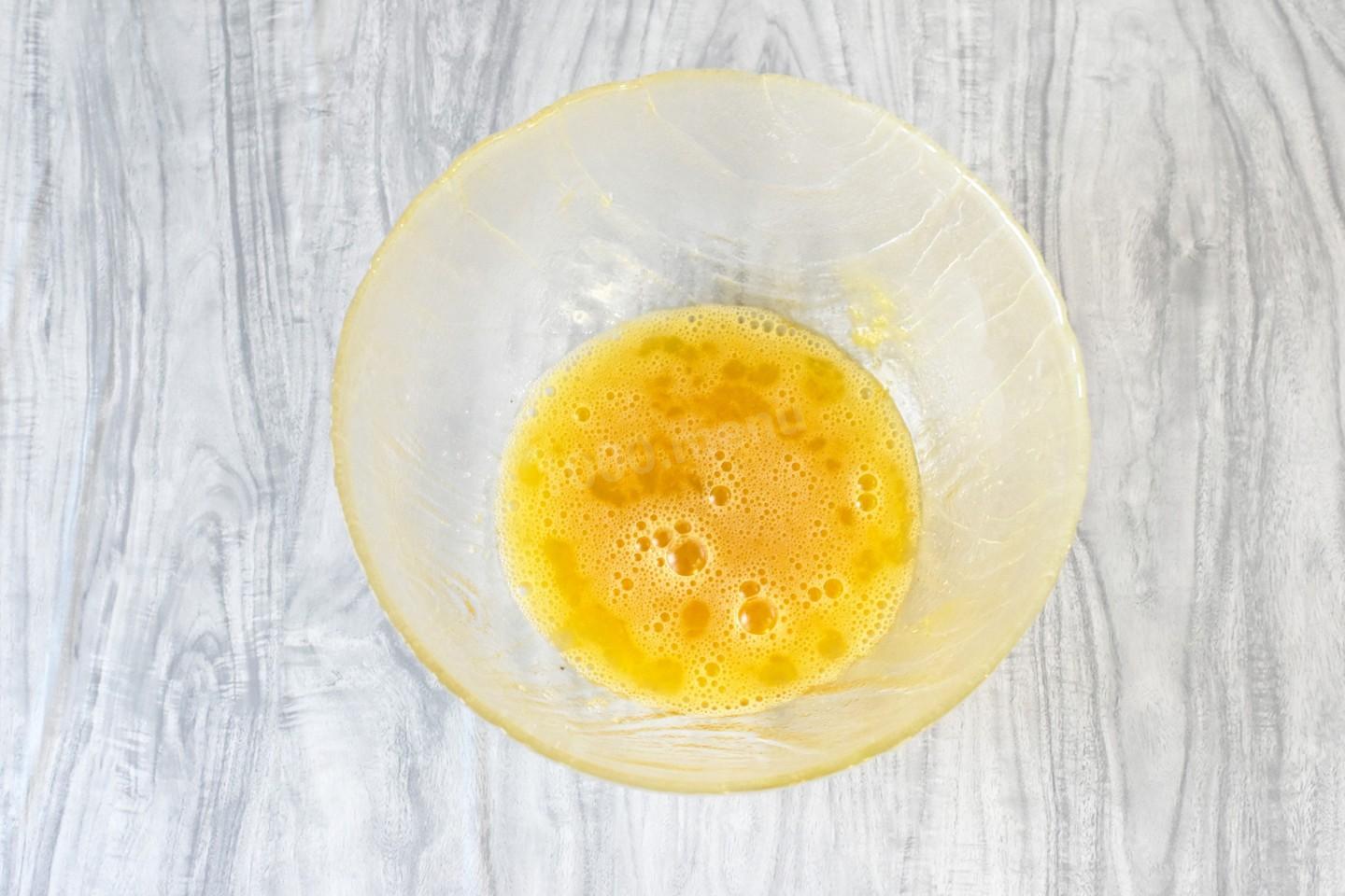 В миске соедините яйцо, сахар и соль и взбейте венчиком до однородности. Яйца предварительно вымойте, чтобы смыть с них загрязнения.