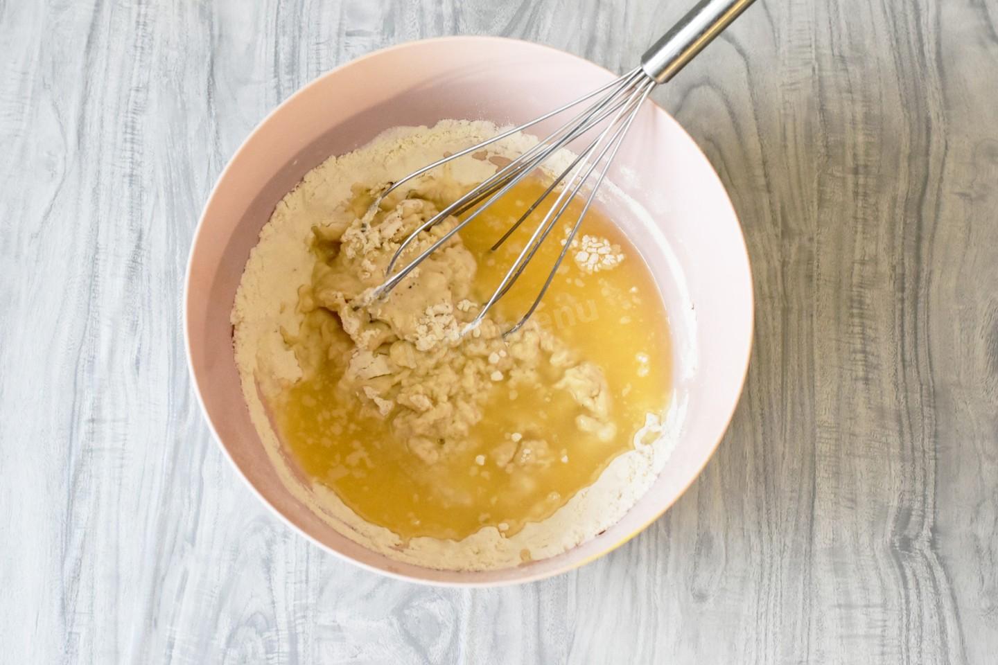 Влейте теплую сыворотку и перемешайте. Сыворотку можете заменить на молоко, кефир или ряженку. В таком случае соду добавлять не нужно. О тонкостях работы с содой можете узнать из статьи под рецептом.