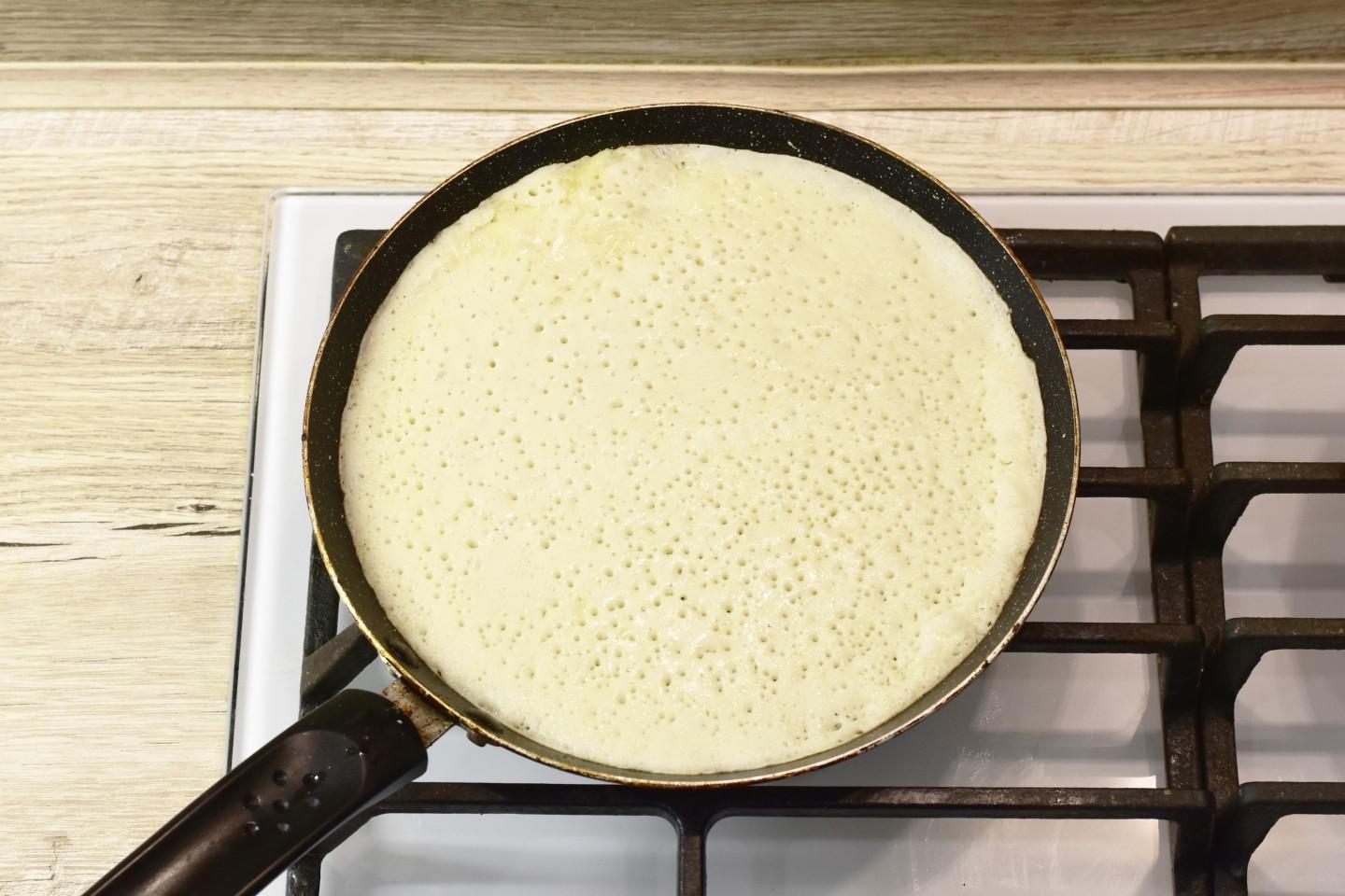 Сковороду раскалите на среднем огне и смажьте растительным маслом. Вылейте в сковороду немного теста и распределите по всей поверхности. Жарьте блинчики примерно по 1-2 минуты с каждой стороны до румяной корочки. Должно получиться около 5-6 блинчиков. Точное количество блинов зависит от диаметра вашей сковороды. Как выбрать сковороду и масло, можно узнать из статьей по ссылкам в конце рецепта. Готовые блины охладите.
