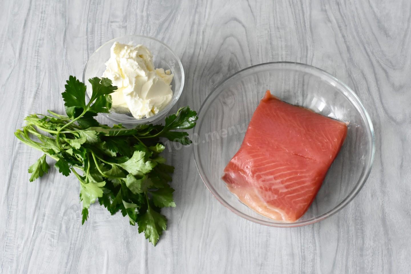 Теперь подготовьте начинку. Творожный сыр можете заменить на плавленый. Какую красную рыбу лучше выбрать для закуски? Подойдёт любая. Это может быть слабосоленая или копченая форель, семга, нерка и т.д. Рецепты слабосоленой домашней рыбы смотрите по ссылке в конце рецепта.