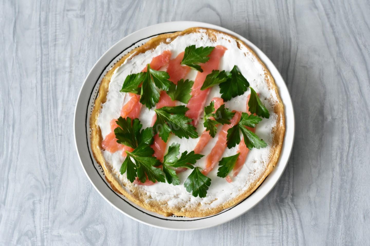 Каждый блинчик смажьте творожным сыром. Сверху распределите несколько ломтиков красной рыбы и петрушку.